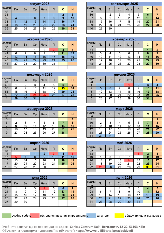 График на занятията учебна 2025/26 година